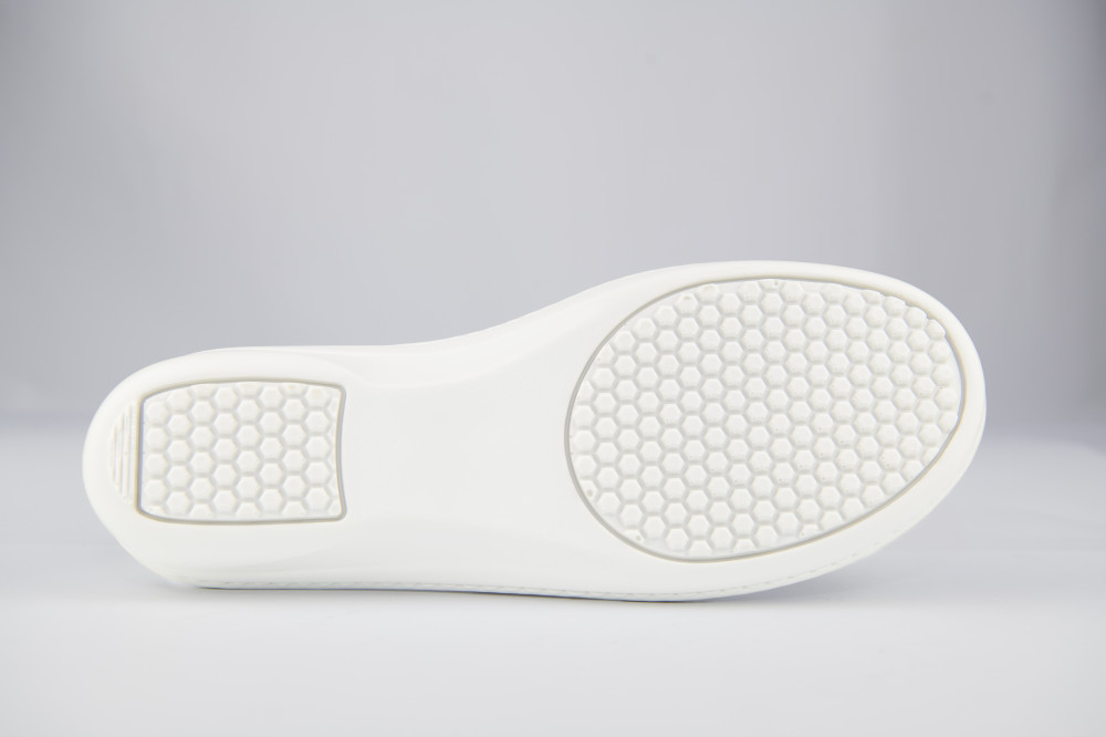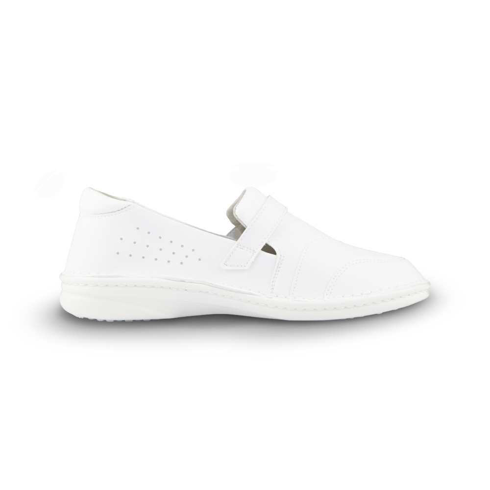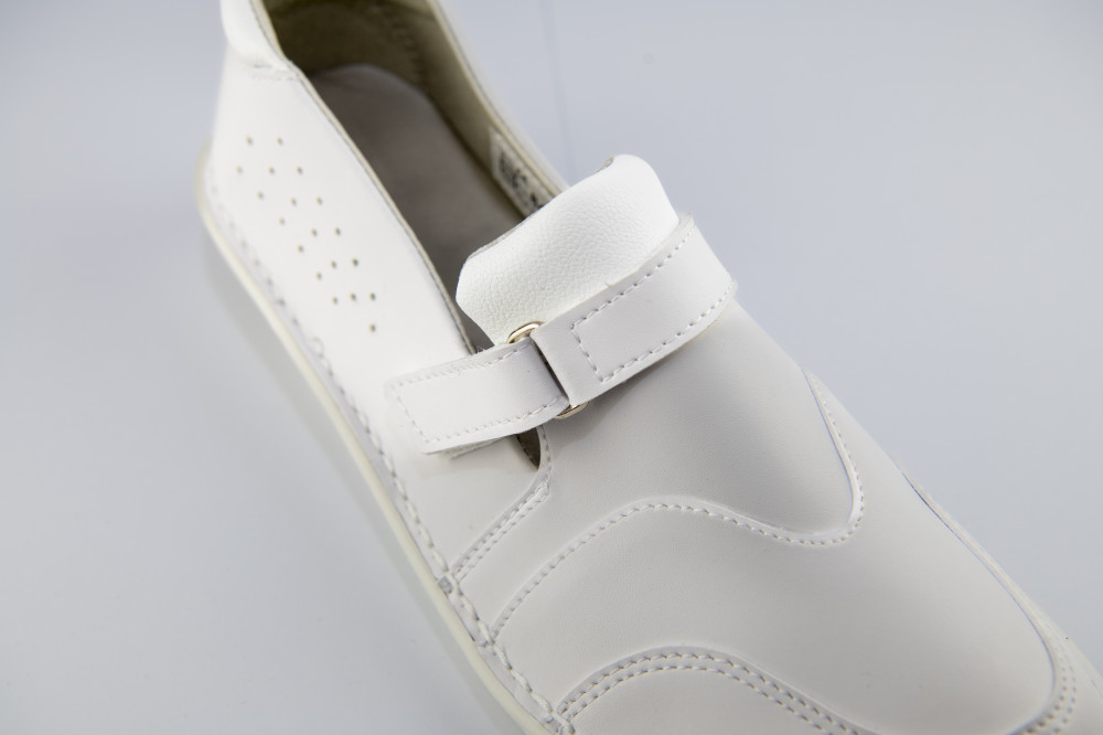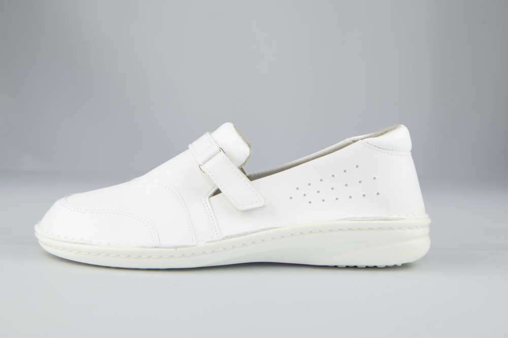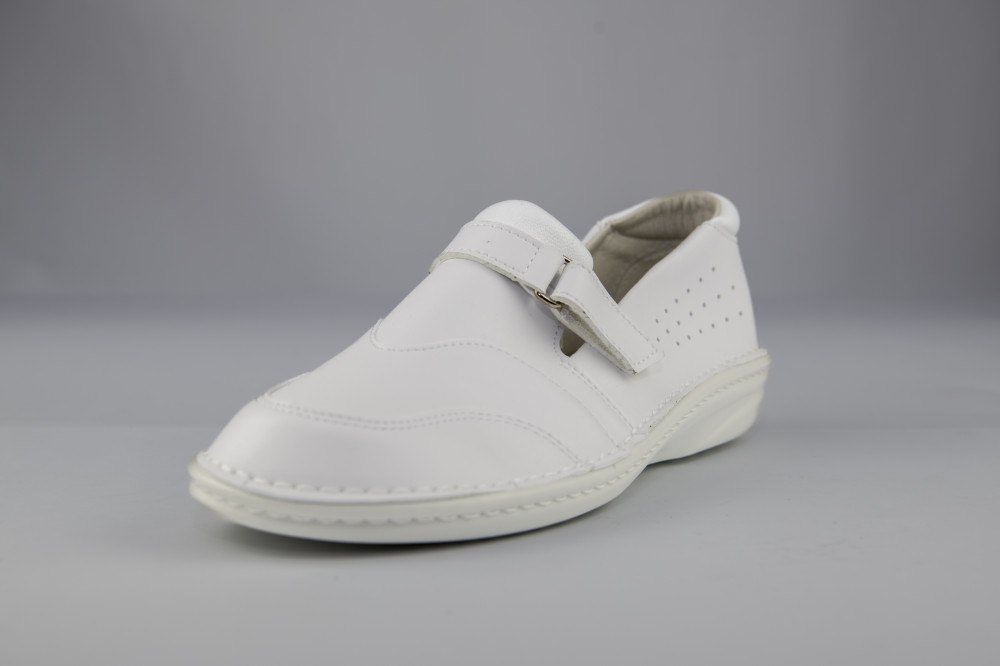 Női fehér félcipő high-tech bőr felsőrésszel, varrott talpszerkezettel, antisztatikus, olajálló és csúszásgátló talppal, sarok energia felvevő képességgel.