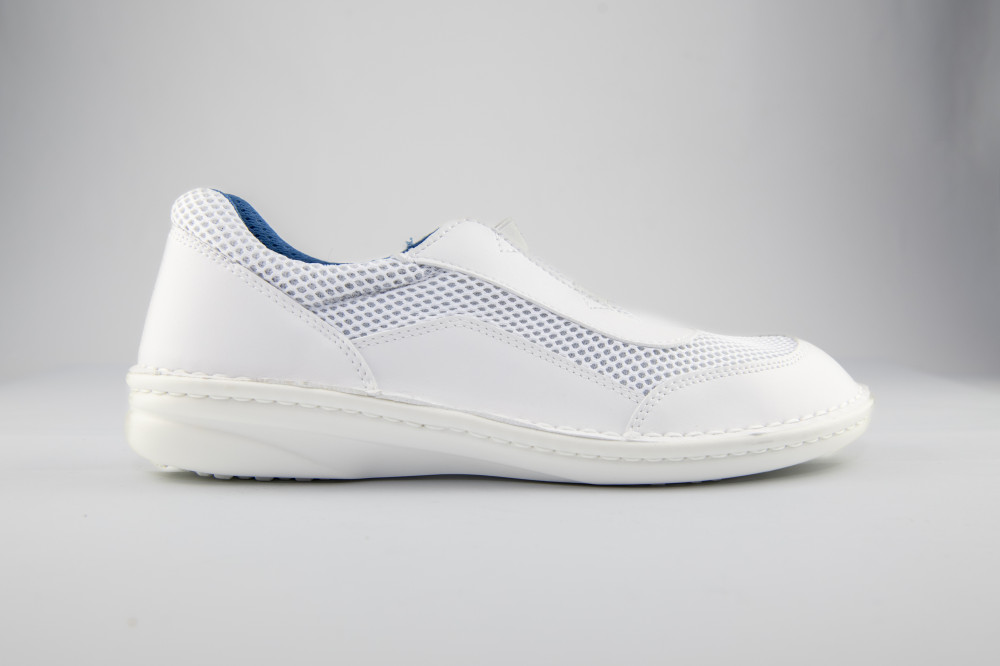 Könnyedén felvehető, bebújós kialakítású női félcipő high-tech bőr felsőrésszel, varrott talpszerkezettel, antisztatikus, olajálló és csúszásgátló talppal.